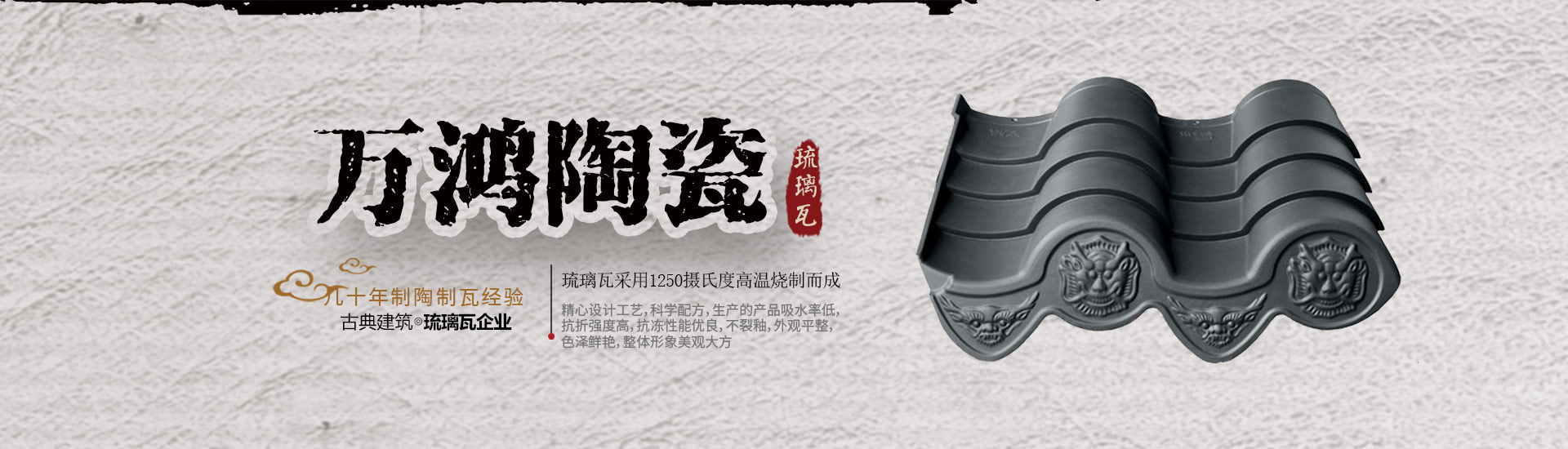 宜興市萬鴻陶瓷有限公司是國內(nèi)生產(chǎn)古建琉璃瓦企業(yè),也是宜興市琉璃瓦行業(yè)龍頭骨干企業(yè)。琉璃瓦采用1250攝氏度高溫?zé)贫桑咀浣?jīng)濟(jì)發(fā)達(dá)的宜興市丁山鎮(zhèn),臨近寧杭高速公路、新長鐵路、錫宜高速和104國道,交通十分便利。  萬鴻陶瓷擁有幾十...